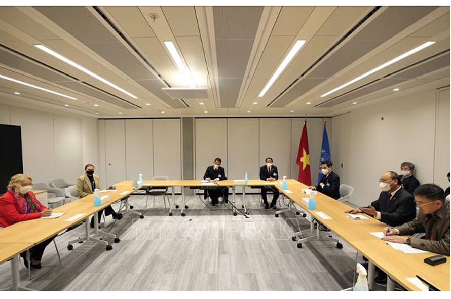 Nhân dịp này, Chủ tịch nước Nguyễn Xuân Phúc cảm ơn LHQ hợp tác hỗ trợ Việt Nam hoàn thành tốt vai trò Ủy viên không thường trực Hội đồng Bảo an LHQ trong gần 2 năm qua; cho biết Việt Nam đang triển khai tham gia hiệu quả vào hoạt động gìn giữ hòa bình LHQ tại Cộng hòa Trung Phi, Nam Sudan và sẽ tiếp tục mở rộng địa bàn, lĩnh vực tham gia thời gian tới, trong đó có lực lượng công binh, cảnh sát dân sự ở các Phái bộ LHQ. Việt Nam cũng đang tích cực ứng cử vào Hội đồng Nhân quyền nhiệm kỳ 2023-2025 cùng một số cơ quan quan trọng khác của LHQ để đóng góp nhiều hơn nữa cho công việc của LHQ.