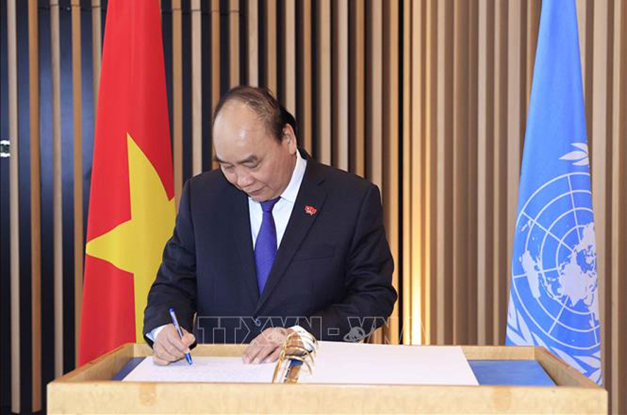 Chủ tịch nước Nguyễn Xuân Phúc ghi sổ lưu niệm tại trụ sở Liên hợp quốc ở Geneve. Ảnh: Thống Nhất/TTXVN