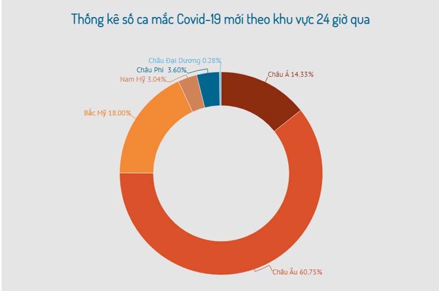 Trong 24 giờ qua, châu lục này cũng ghi nhận tới hơn 353 nghìn ca nhiễm Covid-19 mới, chiếm hơn 60% tổng số ca mắc mới toàn cầu trong ngày. Châu Âu hiện cũng đang dẫn đầu thế giới về số ca tử vong do đại dịch, với 1.442.172 người không qua khỏi trên tổng số 76.282.730 ca mắc kể từ khi đại dịch bùng phát.