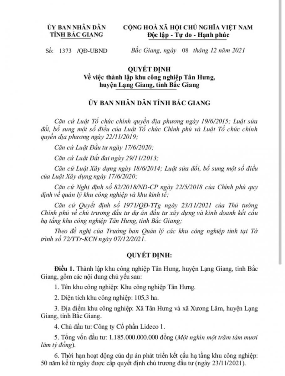 Quyết định thành lập Khu công nghiệp Tân Hưng.
