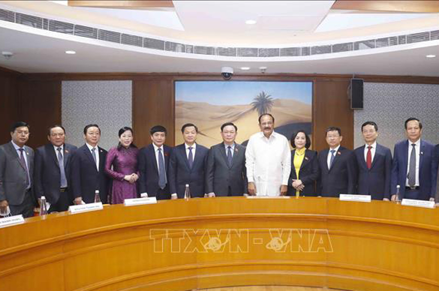 Chủ tịch Quốc hội Vương Đình Huệ và Chủ tịch Thượng viện kiêm Phó Tổng thống Ấn Độ Venkaiah Naidu cùng các đại biểu. Ảnh: Doãn Tấn/TTXVN