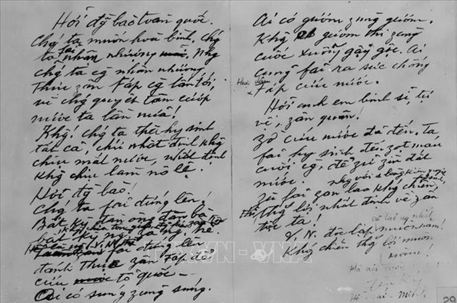 Lời kêu gọi đồng bào cả nước đứng lên chống giặc Pháp xâm lược của Chủ tịch Hồ Chí Minh. Ảnh: Tư liệu TTXVN