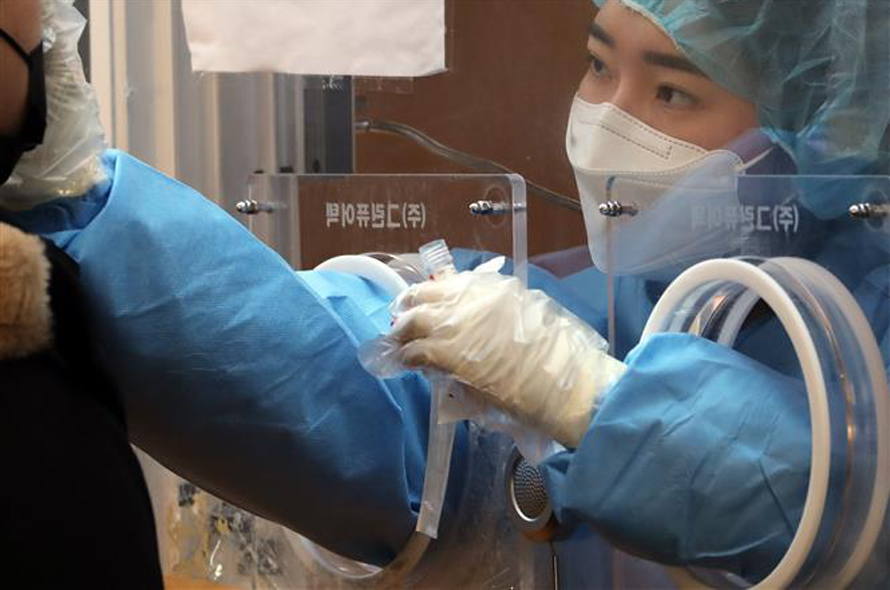 Trong ảnh: Nhân viên y tế lấy mẫu xét nghiệm COVID-19 tại Seoul, Hàn Quốc. Ảnh: YONHAP/TTXVN