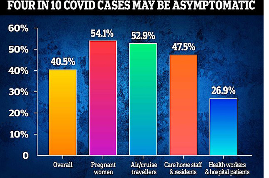 Nhưng khi xét giữa những người dương tính, tỷ lệ người mắc không triệu chứng chung là 40,5%. Và số liệu này ở phụ nữ mang thai là cao hơn với 54,1%, hành khách đi máy bay hoặc tàu biển là 52,9%, và người già cùng nhân viên viện dưỡng lão là 47,5%.