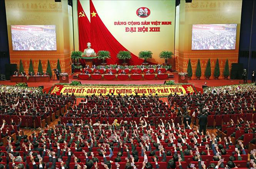 Các đại biểu biểu quyết, thông qua Nghị quyết Đại hội XIII của Đảng. Ảnh: TTXVN