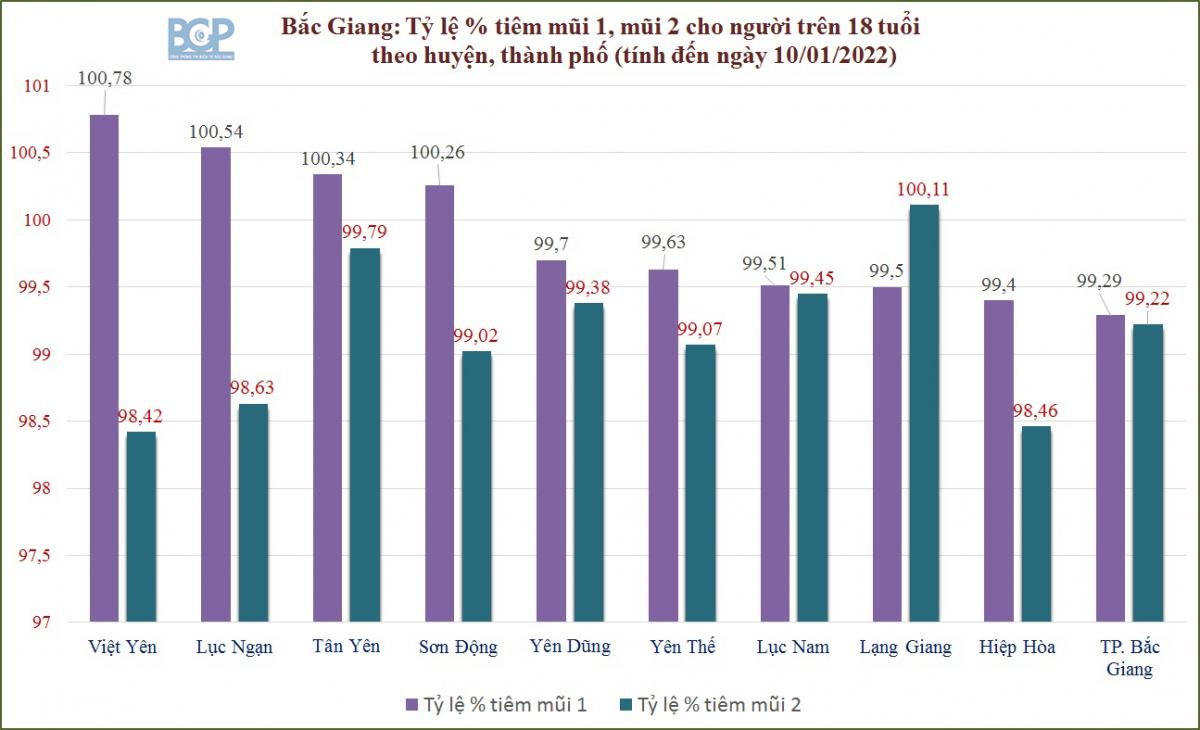 Tính đến ngày 10/01, số liều vắc xin đã tiêm cho người trên 18 tuổi là 2.811.978 liều, mũi 1 đạt 99,87%, mũi 2 đạt 99,1 %. Các huyện Sơn Động, Tân Yên, Lục Ngạn và Việt Yên đã hoàn thành bao phủ mũi 1; các huyện còn lại đều đạt từ 99% trở lên. Huyện Lạng Giang hoàn thành xong việc tiêm mũi 2, các huyện và thành phố đều đạt trên 98% bao phủ mũi 2.