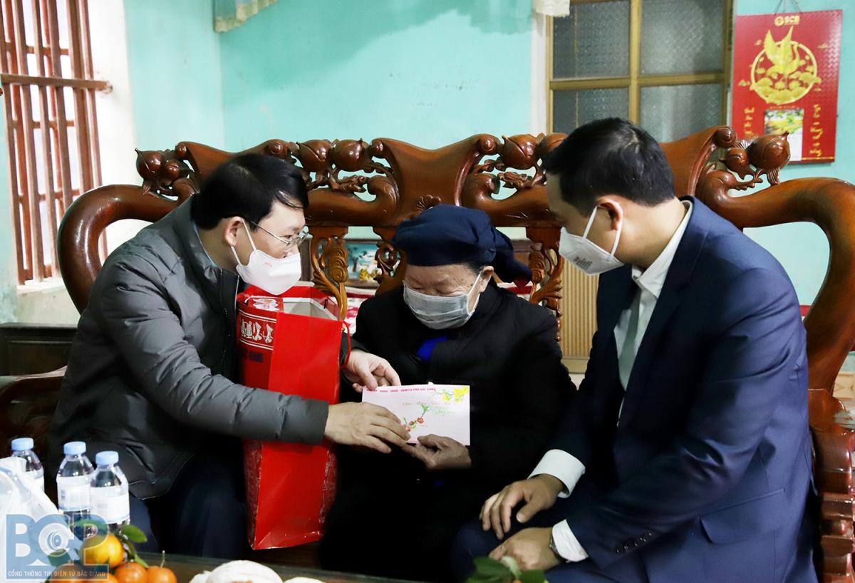 Chủ tịch UBND tỉnh Lê Ánh Dương tặng quà Tết cho bà Hoàng Thị Ón, vợ liệt sĩ Lâm Văn Chè tại thôn Cống,