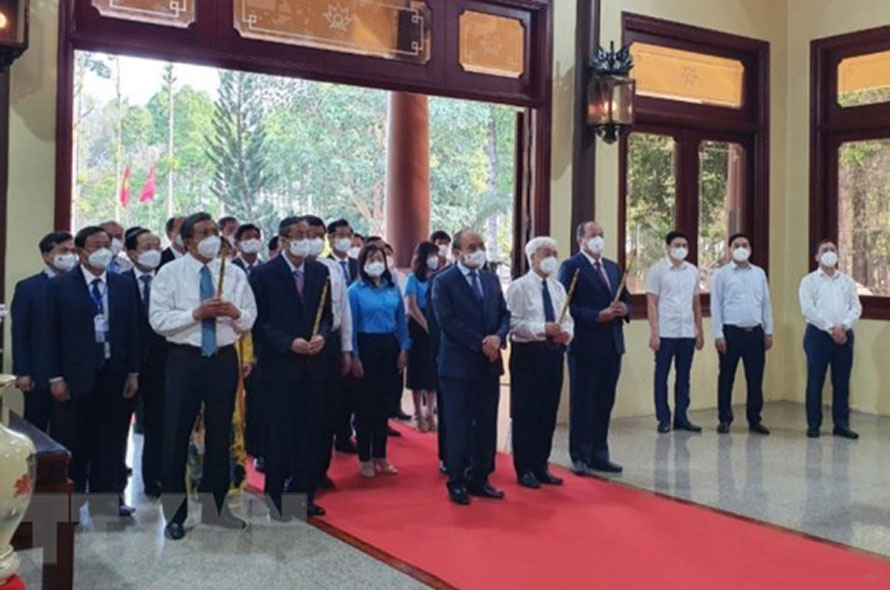 Chủ tịch nước Nguyễn Xuân Phúc cùng Đoàn công tác dâng hương tưởng niệm Chủ tịch Tôn Đức Thắng. (Ảnh: TTXVN)