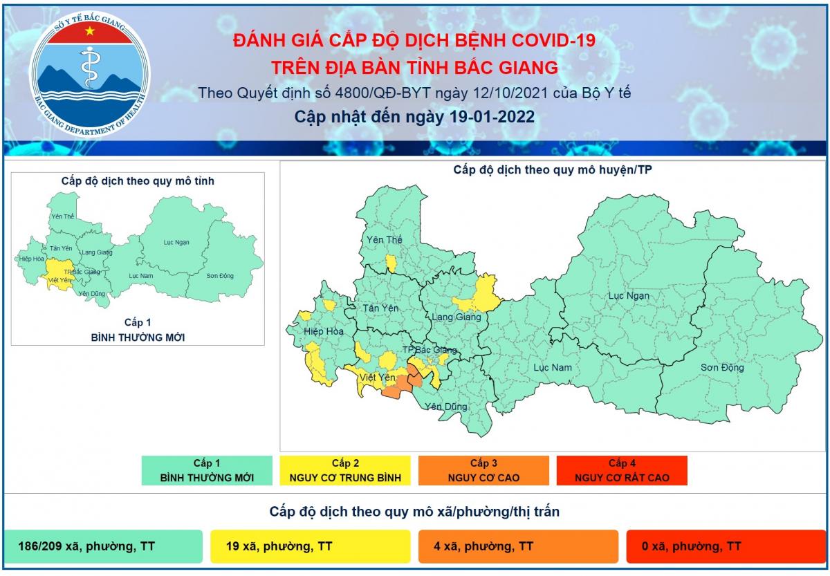 Về đánh giá cấp độ dịch: Toàn tỉnh cấp độ 1. Huyện, thành phố có 09/10 đơn vị cấp độ 1, huyện Việt Yên cấp độ 2. Xã, phường thị trấn có 04 đơn vị cấp độ 3 (xã Tăng Tiến, xã Quang Châu và xã Vân Trung thuộc huyện Việt Yên; xã Nội Hoàng, huyện Yên Dũng), 19/209 đơn vị cấp độ 2 (05 TP. Bắc Giang, 06 huyện Việt Yên, 02 huyện Lạng Giang, 01 huyện Yên Thế và 05 huyện Hiệp Hòa) và 186/209 đơn vị cấp độ 1 (chi tiết xem tại http://covid19.ytebacgiang.com).