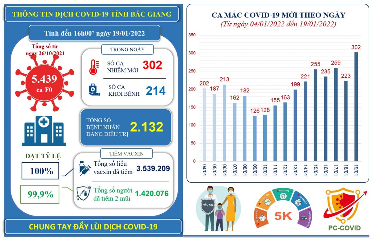 Theo Sở Y tế, đến 16h00’ ngày 19/01/2022, trên địa bàn tỉnh Bắc Giang ghi nhận 302 ca mắc mới COVID-19 (ca F0). Từ ngày 26/10/2021 đến nay, toàn tỉnh ghi nhận 5.137 ca F0. Cụ thể: