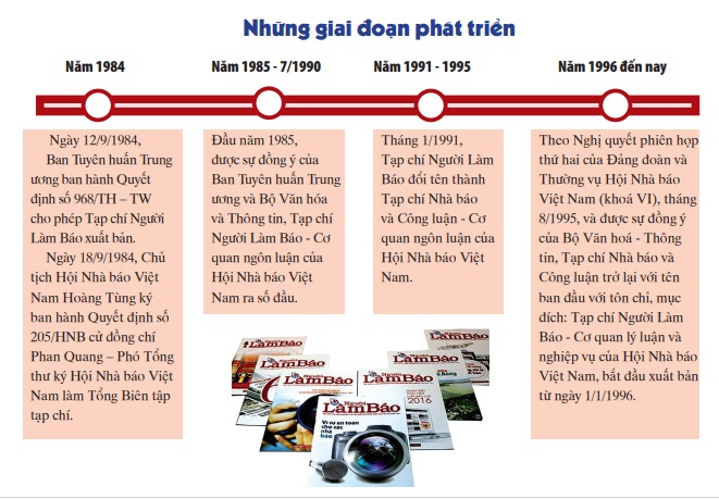 Sau một thời gian chuẩn bị, đầu năm 1985, Tạp chí Người Làm báo chính thức xuất bản số đầu tới bạn đọc. Từ dấu ấn khai mở ấy, Tạp chí tự hào đã làm nên một hành trình dài hơn 35 năm với nhiều đóng góp, trở thành cầu nối giữa những người làm báo với bạn đọc và giữa bạn đọc với những người làm báo; thực sự là cơ quan lý luận nghiệp vụ của Hội Nhà báo Việt Nam và giới báo chí Việt Nam.