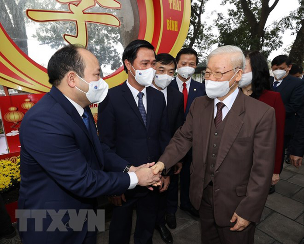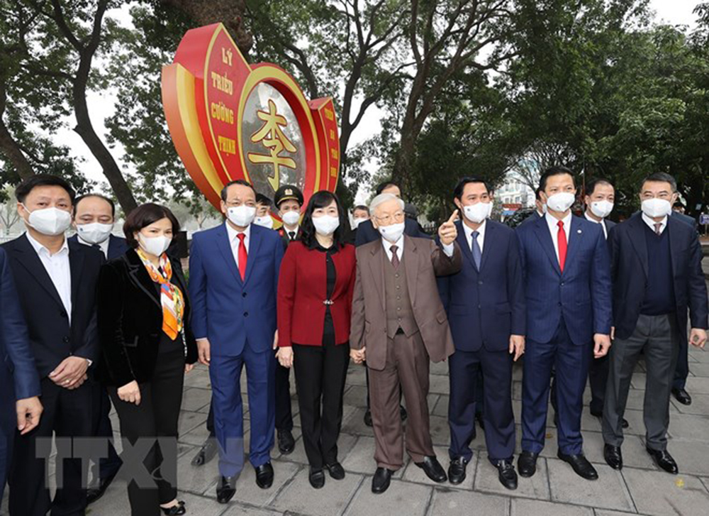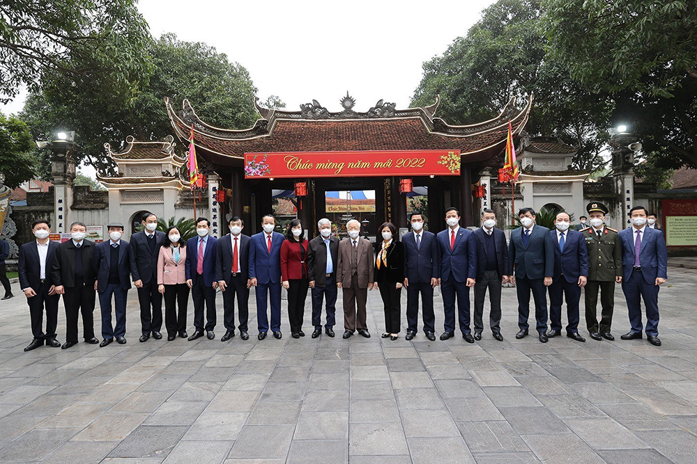 Tổng Bí thư Nguyễn Phú Trọng với các đại biểu tại Di tích lịch sử-văn hóa Đền Đô (phường Đình Bảng, thành phố Từ Sơn). Trí Dũng/TTXVN)