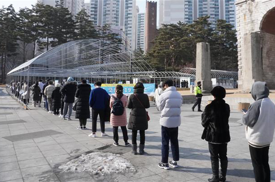 Người dân xếp hàng chờ xét nghiệm COVID-19 tại Seoul, Hàn Quốc, ngày 23/1/2022. Ảnh: Yonhap/ TTXVN