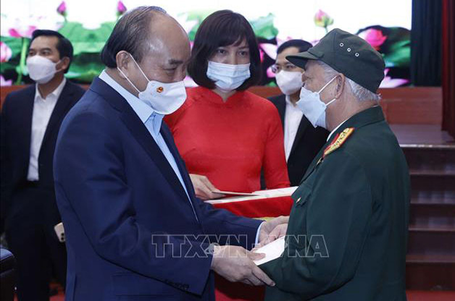 Chủ tịch nước Nguyễn Xuân Phúc tặng quà Tết cho các đối tượng chính sách. (Ảnh: TTXVN)