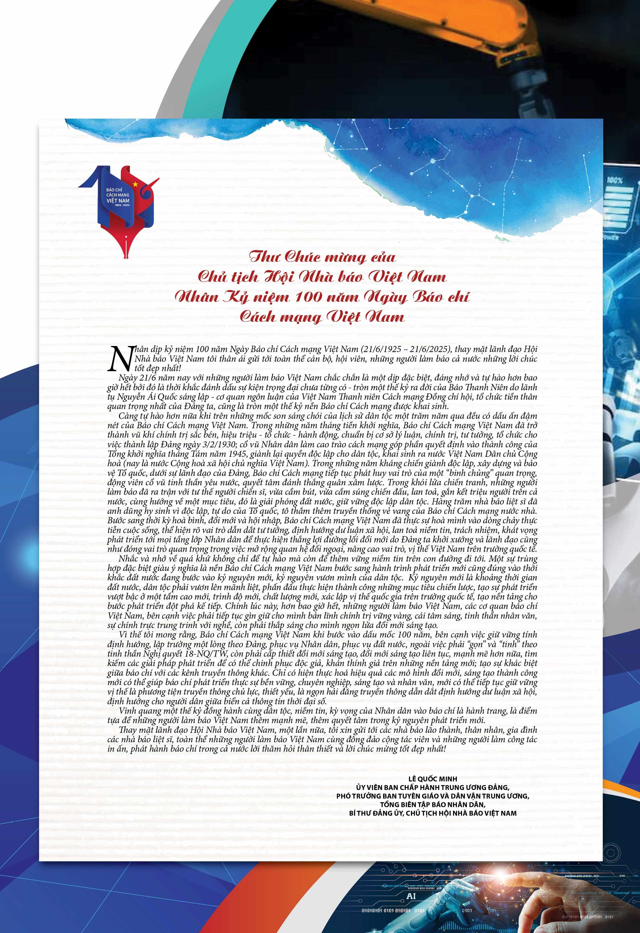 Thư Chúc mừng của Chủ tịch Hội Nhà báo Việt Nam nhân Kỷ niệm 100 năm Ngày Báo chí Cách mạng Việt Nam