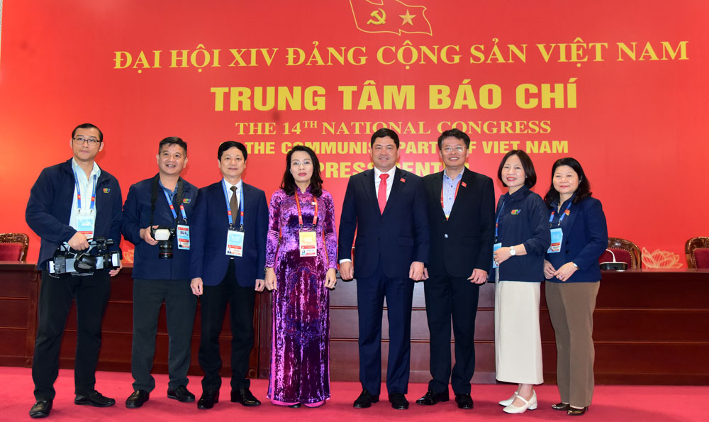 Các đồng chí: Nguyễn Hồng Thái, Nguyễn Thị Hương chụp ảnh lưu niệm với phóng viên Báo và Phát thanh, Truyền hình Bắc Ninh tác nghiệp tại Trung tâm Báo chí Đại hội XIV. |